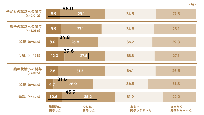 見守る、とはどういうことでしょうか。親は子どもに対してどのようなサポートができるのでしょうか?親子の関係についての意識と実態(明治安田生活福祉研究所)によると、約4割の親が子どもの就職活動に関与したと回答しており、婚活に至っては約半数が関与したいと回答しています。