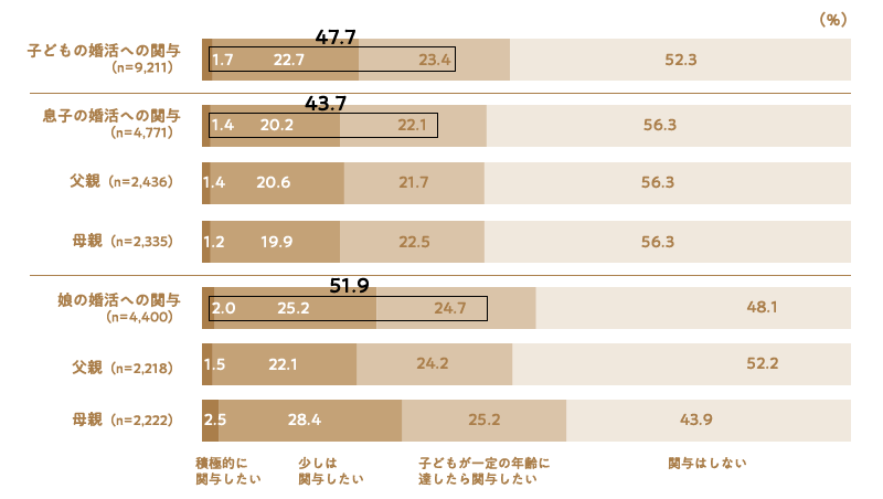親世代は結婚や出会いを意識する子どもたちに対し、必要以上に「まだ早い」という意識を持たせないよう注意し、安心してパートナー探しができるようサポートしていきたいものです。