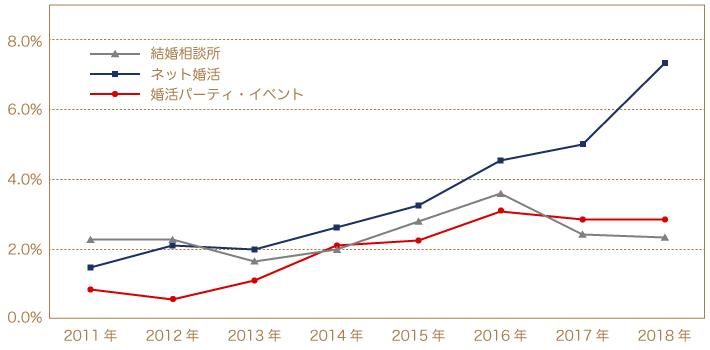 各婚活サービスの内訳を見てみますと、以下のようになりました。2013年からネット婚活の割合が一番多くなり、以後その傾向が強まっています。また、今年私が独自に行ったインターネット調査でも2018年の調査結果とほぼ同じ割合になりました。