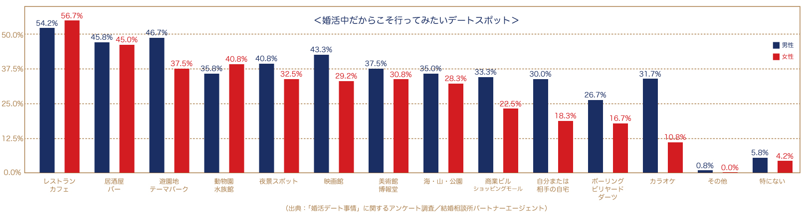 この調査によると、男女共に1位となっているのは「レストラン、カフェ」。ゆっくりと話が出来るだけではなく、料理の好みが合うか否かや食事のマナーや店員さんに対する態度や言葉使いなど、毎日の生活を共にすることになるかもしれない相手の人間性や社会性が垣間見える場でもあるようです。