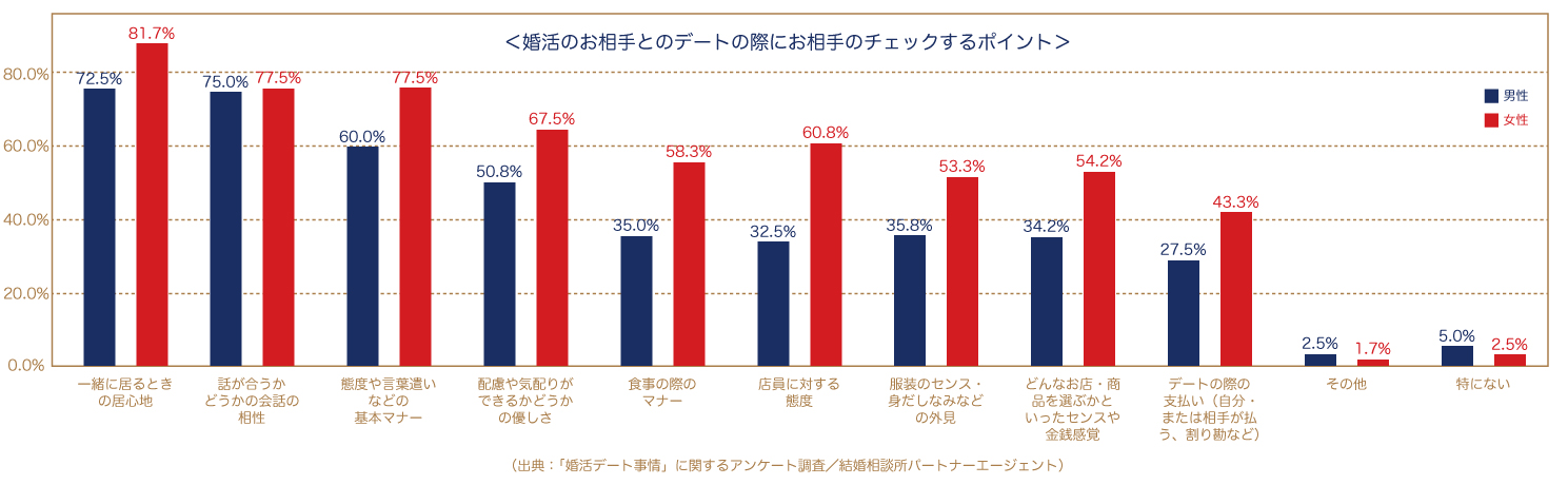 ところが、これが婚活中の二人となると少し事情が変わっているようです。というのも、婚活中のデートの目的はずばり「一生の伴侶を選ぶこと。」そのため、恋愛中とは違う視点で、相手の人柄や立ち居振る舞いなどを意識する方が多いようです。生涯にわたり衣食住を共にする相手を探すのですから、互いの価値観や趣味嗜好が合うか否かはもちろん、相手がどのような心意気でデートに臨んでいるのか知りたいもの。