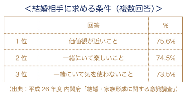 内閣府が行っている調査によると、男女が結婚相手に求める条件のベスト3は、価値観が近いことが最も高く、次いで、一緒にいて楽しいこと、一緒にいて気をつかわないことが続きました。