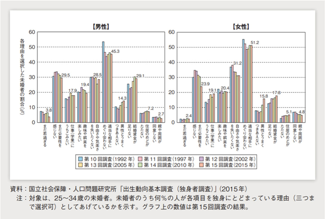 未婚者(25~34歳)に独身でいる理由を尋ねると、男女ともに「適当な相手にめぐり会わない」(男性:45.3%、女性: 51.2%)が最も多いとあります。