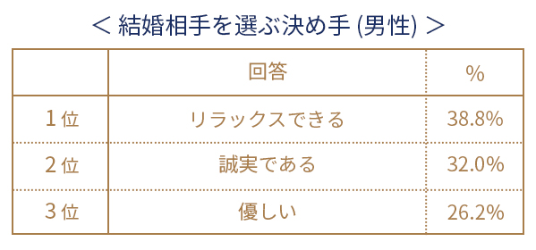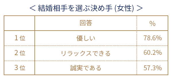 (引用:セキララゼクシィ【男女別】結婚相手を選ぶ決め手とは? 既婚者に徹底リサーチ!
