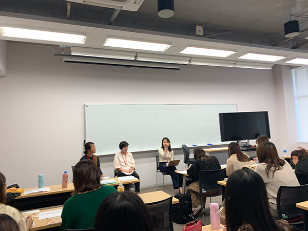 今回のセミナーに参加されたのは、人間社会学部人間社会学科の大学2年生25名です。「保活」「育児休暇」「働き方の多様化」などをテーマに事前学習を行った上でセミナーを受講しました。セミナーでは、ゲストの方2名にご登壇いただき、仕事や結婚、子育てなど、様々な経験を聞きながら、多様な生き方の選択肢を知り、参加者自らがライフプランについて考える機会としていただきました。