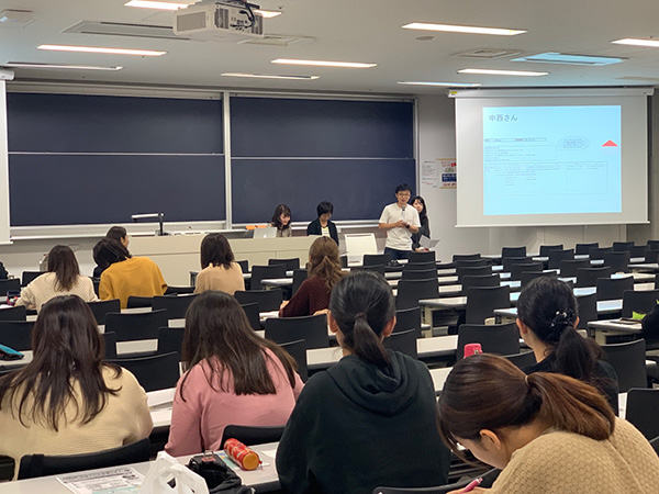 今回のセミナーに参加されたのは、社会福祉学科の大学1~4年生130名です。日本社会の「結婚・子育て」に関わる就労支援のあり方を社会的な視点と現場からの視点で学習した上で、セミナーを受講しました。セミナーでは、ゲスト3名にご登壇いただき、仕事や結婚、子育てなど様々な経験を聞きながら、多様な生き方の選択肢を知り、参加者自らがライフプランについて考える機会としていただきました。